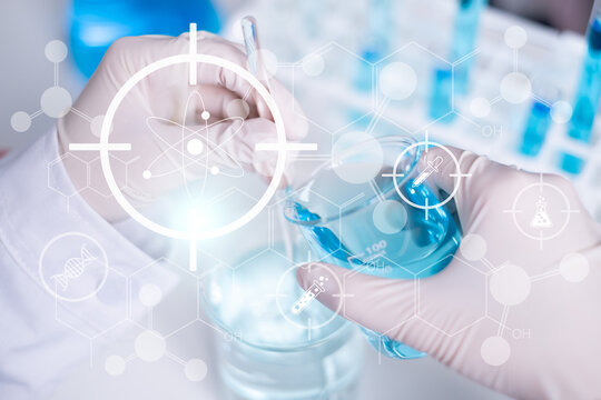 Close-up scientist pouring blue liquid from beaker science chemistry research experiment microscope virus flask biohazard