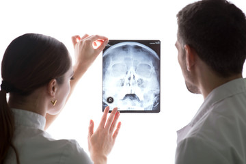 Two doctors analyzing brain xrays on computer