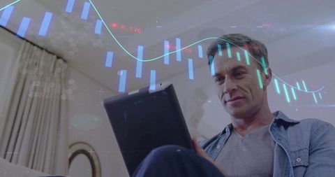 Man analyzing stock market trends at home with tablet