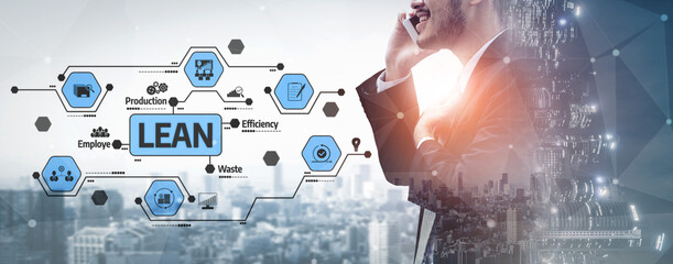 A professional businessman communicates key lean management principles against a city backdrop, showcasing innovation and efficiency through modern graphic design elements. Tessel