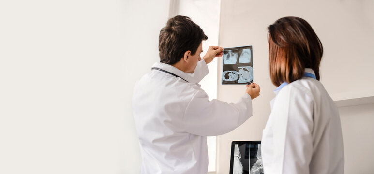 In medical room two young doctors radiologists analyzing x-ray and computer tomography film and discuss the xray diagnostic.