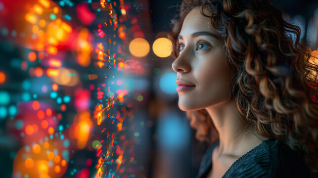 Intense focus: A data analyst meticulously reviews complex financial charts on a large screen, deeply immersed in the numbers. The glow of the screen illuminates their form.