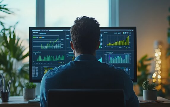 Man Analyzing Stock Market Data on Multiple Computer Screens