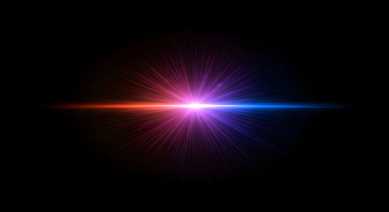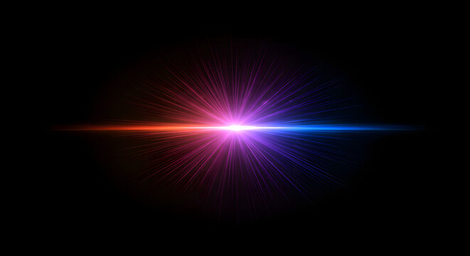 Bright digital explosion of light with intense red and blue starburst rays. Futuristic cinematic anamorphic lens flare overlay on a dark black background, abstract energy design.
