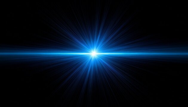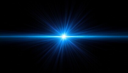 Abstract blue optical lens flare with anamorphic light streak and glowing rays. Digital camera effect for overlay, screen mode, or background design element. Isolated on a black background.