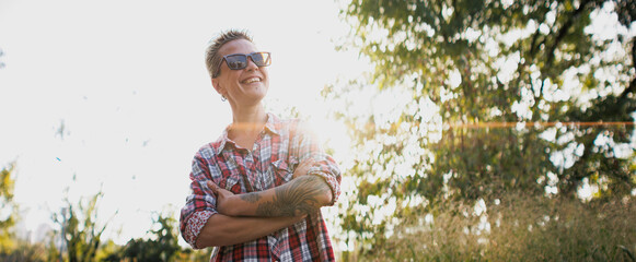 Cheerful tattooed woman in sunglasses standing in park with sunlight, banner