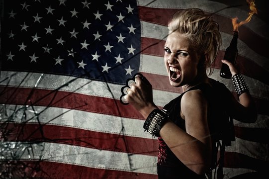 Riots break out following the USA 2024 election results.An young man with an American flag stands amidst burning cars and furious crowds, back view.
