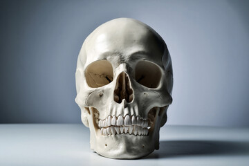 Un teschio umano è raffigurato su uno sfondo uniforme. I lineamenti del cranio sono evidenziati da una fonte di luce calda e dal basso, che ne enfatizza i contorni e proietta ombre sottili.