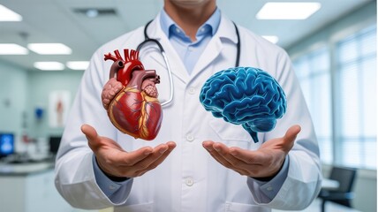 Doctor in consultation room holding anatomical brain model for medical explanation