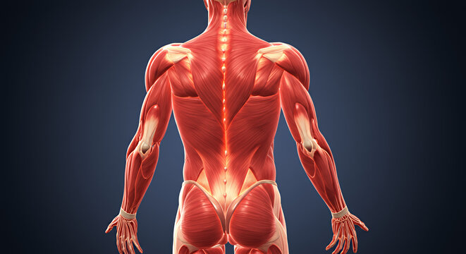 Detailed 3D Render of Glowing Human Muscular System Posterior View
