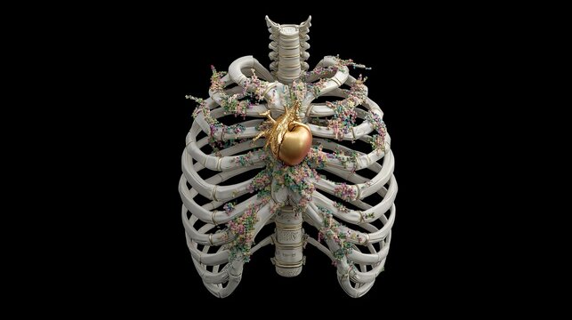 3D anatomical rib cage with golden heart and colorful molecular structures on black background blending anatomy and biochemistry