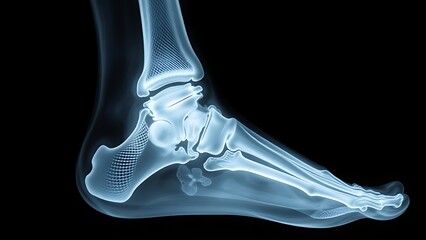 calcaneus. Medical X-ray showing detailed anatomical structure of a human heel bone on black. STEM education sheets, lab safety posters, designed for biotech research communications.
