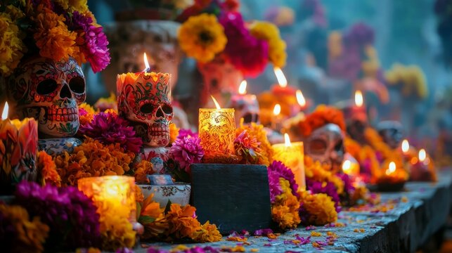 Dia de los Muertos Altar with Colorful Sugar Skulls and Candles, Ai Generated Images.