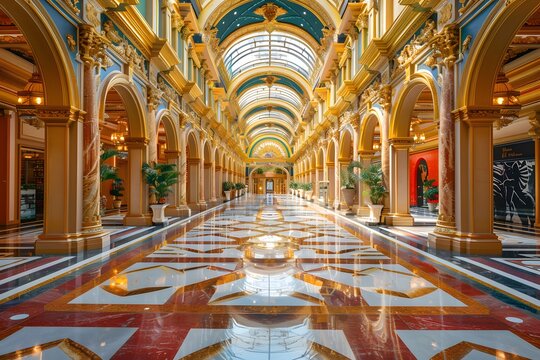 Ancient temple hallway illuminated by golden sunlight, creating a serene and magical atmosphere. This captivating scene evokes a sense of history and tranquility. Ideal for travel, history. AI