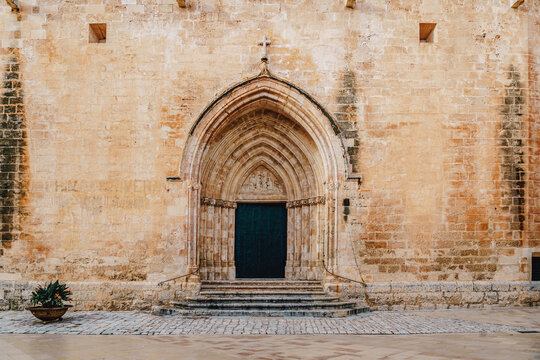 Gothic entrance of the Ciutadella de Menorca Cathedral are presented, featuring its iconic archway and historic stone. This prominent religious landmark is a part of Menorca cultural heritage