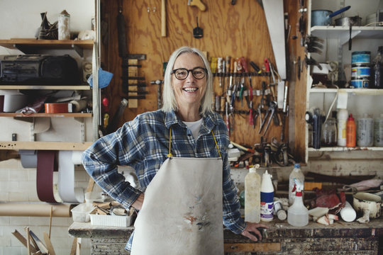 Portrait of smiling senior owner standing against tools at workshop