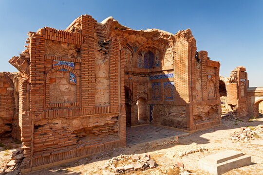 View of weathered brick architecture adorned with blue tilework stands against the stark desert landscape under a clear sky, Thatta, Sindh, Pakistan.