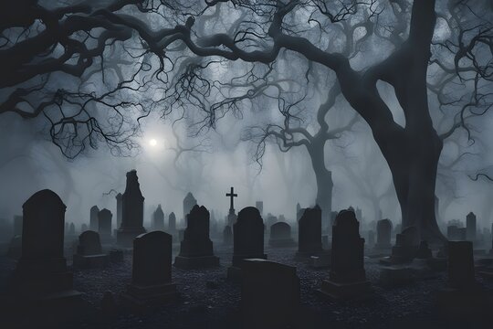 A dark foggy graveyard with twisted tree silhouettes and eerie glowing mist creeping, AI Generated