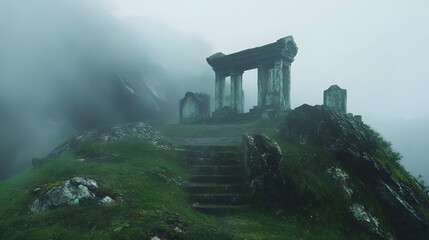 Monochrome stone tablets with ancient script in mystical landscape, ten commandments concept