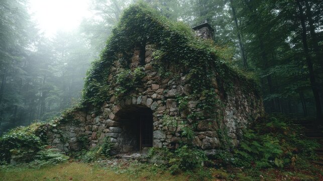 A medieval chapel with arched windows and a bell tower surrounded by misty hills