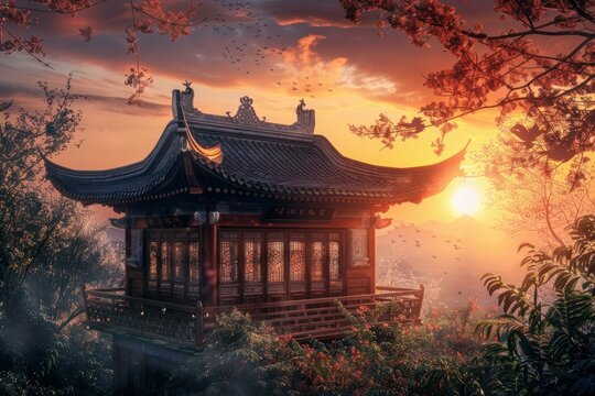 Epic ancient Chinese warrior cavalry scene with commander holding red battle flag. Dynamic composition showing mounted soldiers in traditional armor against dramatic sunset and imperial architecture
