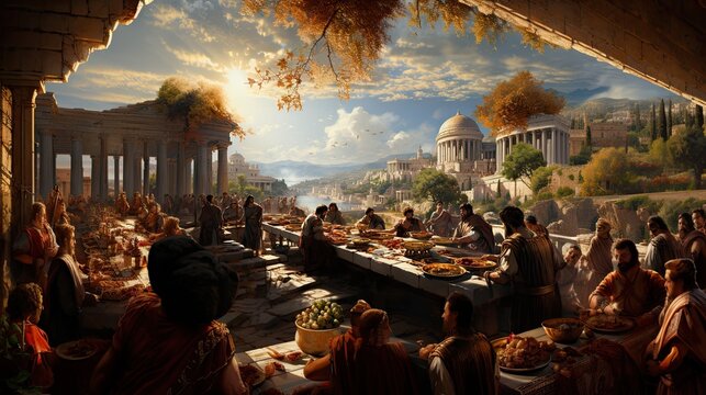 A vibrant depiction of an ancient Greek banquet with guests enjoying a feast amidst temple ruins at sunset