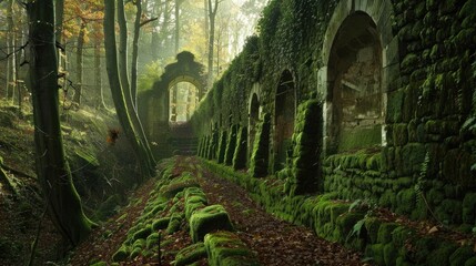 Ancient stone aqueduct with sunlight streaming through arches