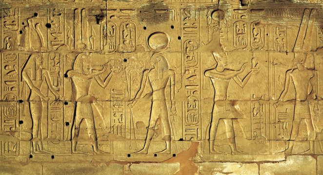 Hieroglyphic carvings in ancient egyptian temple
