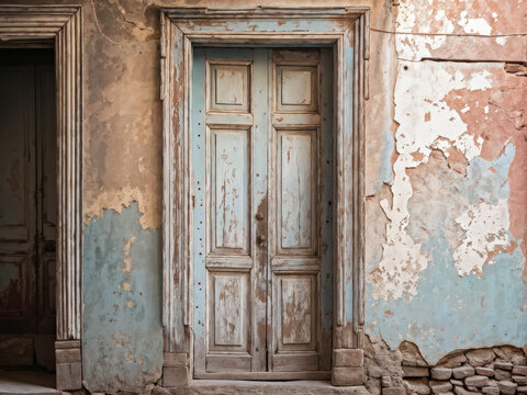 ancient architectural door with stone arcade archway and surrounding wall isolated on white background