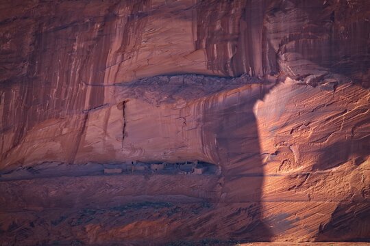 Cliff dwellings, Canyon de Chelle, Arizona. Amazing geology showing in sun and shade on the cliff face.
