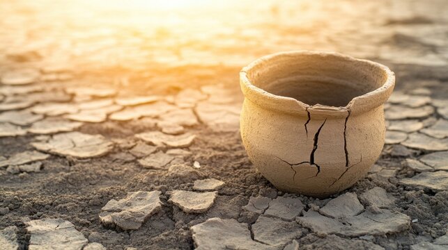 Pile of chipped ceramic shards scattered on cracked dry earth under a cloudy sky with sunlight