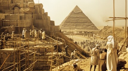 Skilled Egyptian Craftsmen Carving Intricate Hieroglyphs on Great Pyramid Stones with Precision and Expertise