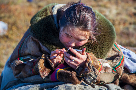 Yamalo-Nenets Autonomous Okrug, extreme north, Nenets family in the national winter clothes of the northern inhabitants of the tundra, the Arctic circle