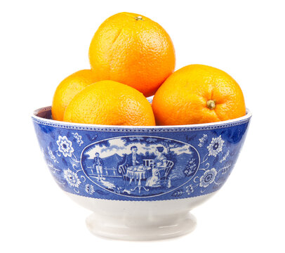 Abundant tropical fruit in ancient clay vase with palm fronds background