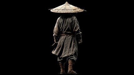 Lone warrior in traditional robe and straw hat walking away in darkness.