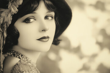 Retro vintage image portrait of a young caucasian woman in 1920s wearing an elegant dress and a hat