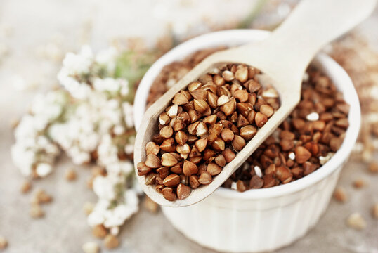 Wooden spoon of roasted buckwheat and groat jar, gluten free ancient grain for healthy diet, selective focus, shallow DOF