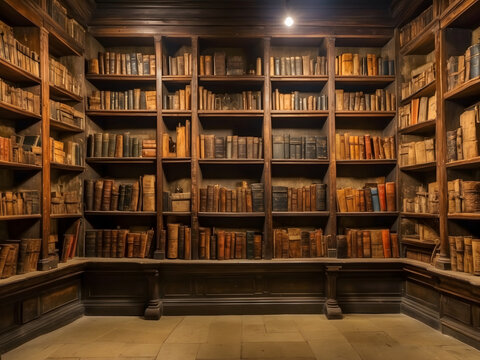 Ancient gothic library, dark and eerie library, magic medieval library full of old ancient books. Old wooden shelves holding many historical books and manuscripts.