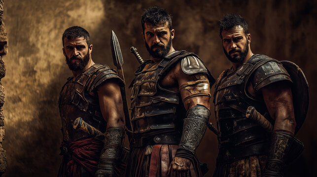 Three strong warriors in ancient armor posing with intense expressions in rustic setting, depicting historical battle readiness