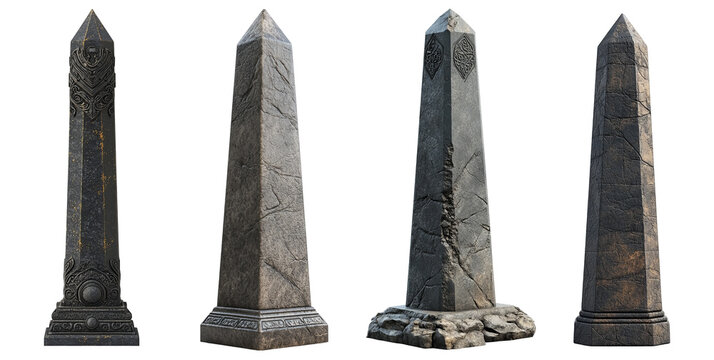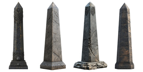Ancient stone obelisks with engravings weathered historical monuments transparent background