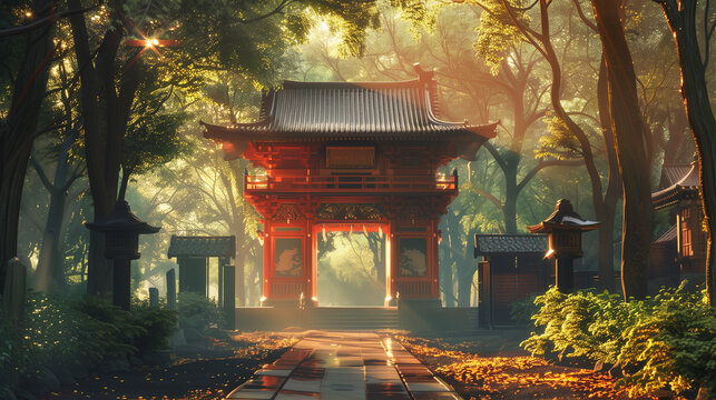 : beautiful landscape of a Chinese temple in the middle of the forest.
