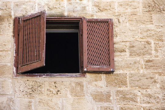 ancient window with shutters in a stone house, the ancient city of Jaffa, Israel