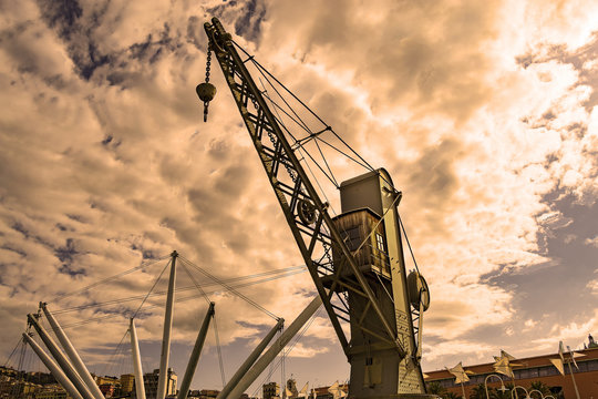 Panoramic elevator Bigo in the ancient port of Genoa on Mediterranean Sea, at night, Italy.