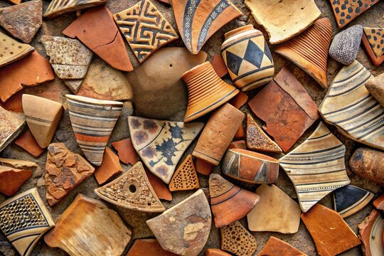 ancient pottery shards and fragments on ground top view