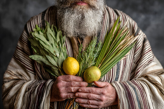 An Orthodox, Jewish man holds the four species lulav - etrog or citron fruit, willow and myrtle branches and a palm frond - used in the ritual observance of the Jewish holiday of Sukkot..
