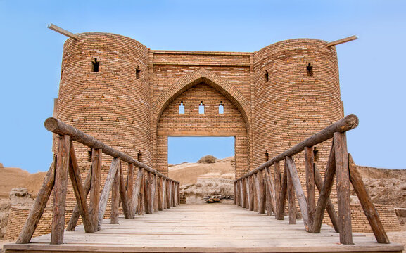 Entrance to the ancient settlement of Otrar, a bridge and a fortress, the ruins of an ancient city, medieval architecture.