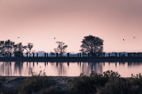 Pink reflections at sunset on the ancient salt caves of Cervia - Emilia Romagna Italy