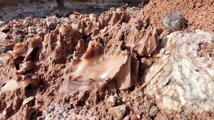 Breathtaking volcanic rock formation with natural salt deposits under clear blue sky