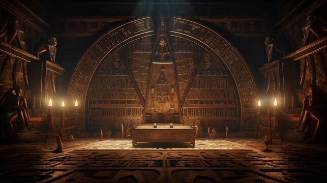 Set of sacred symbols and ornaments of ancient Egypt. Image of inside an ancient Egyptian pyramid, with various artifacts on the ground and heliographs on the walls. Treasure of ancient Egypt.