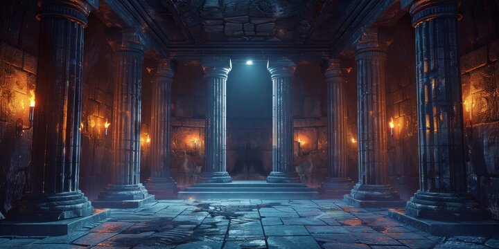 An eerie ancient underground temple with towering pillars and glowing torches lighting the dim space.